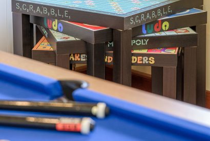 The games hall is also located on the first floor with armchairs, a pool table, a Smart TV and a selection of classic board games and toys. It’s the perfect place for younger guests to relax and enjoy their own space.
