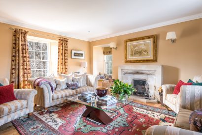 Upstairs on the first floor, there is a stunning drawing room which is the ideal spot to socialise together on rainy days or snuggle up for movie nights. It features a cleverly concealed Smart TV on the wall, a fireplace with a real log fire, sofas and window seats.