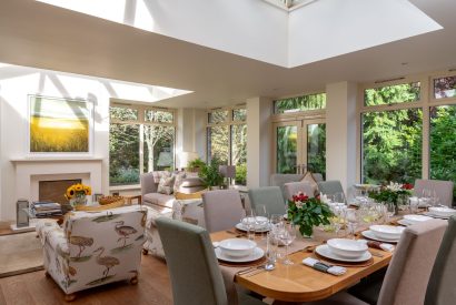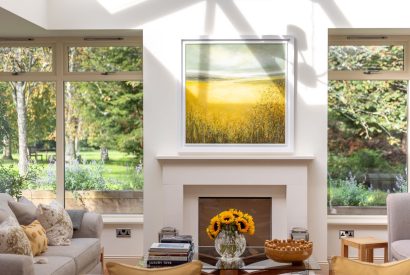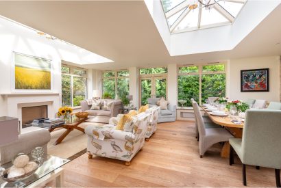 On the ground floor, there’s a sun room flooded with natural light that offers views of the gardens. Perfect for sipping your morning coffee and contemplating the day ahead. There’s also a remote-controlled fire and sofas for you to really get cosy.