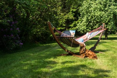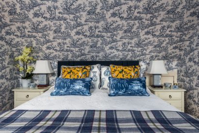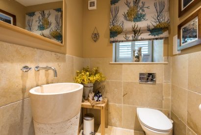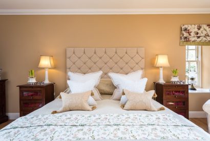 On the second floor there’s a super-king-size bedroom with a bed that can be split into twin beds on request. This room has an en-suite shower room with walk-in rainfall shower. There’s also a master suite with views of the gardens, a super-king-size bed and an en-suite bathroom with a rolltop bath, walk-in rainfall shower and bidet.