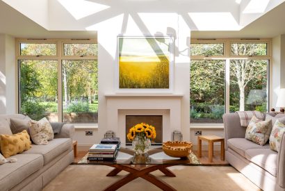 On the ground floor, there’s a sun room flooded with natural light that offers views of the gardens. Perfect for sipping your morning coffee and contemplating the day ahead. There’s also a remote-controlled fire and sofas for you to really get cosy.