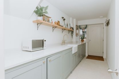 The six bedrooms each present their own character and comfort. The ground-floor bedroom features a plush super-king-size bed framed by a large bay window that floods the room with morning light. Upstairs, the master suite indulges guests with a super-king bed, soft neutral tones, and a luxurious en-suite bathroom complete with a walk-in rainfall shower. Another king bedroom offers elegance and calm, with garden views and sumptuous linens. The twin bedrooms, each with two single beds, are perfect for children, friends or flexible sleeping arrangements, one of which enjoys its own en-suite. The final super-king bedroom exudes understated glamour, featuring deep-toned accents and plush textiles for a serene night’s rest. A large family bathroom with freestanding tub and separate shower completes the upper floor, designed with indulgent pampering in mind.