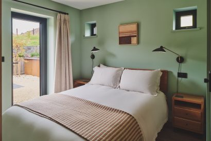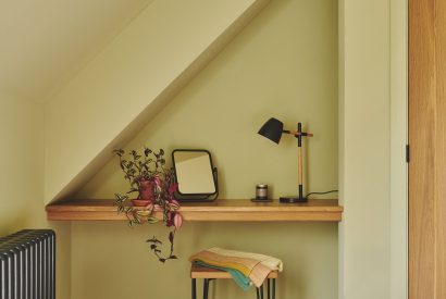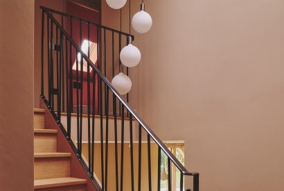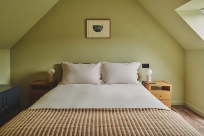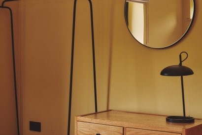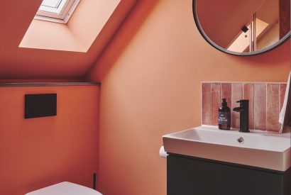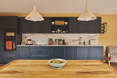 The kitchen’s colour scheme is inspired by the iron oxide tones of local Welsh stone, while high-spec Scandinavian lighting features throughout, illuminating the elegant architectural details. The open-plan layout creates a natural flow between the fully equipped kitchen, sociable dining area and inviting living space, where a wood-burning stove, L-shaped sofa and a striking Ukrainian woollen wall hanging form a warm, communal hub.