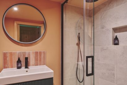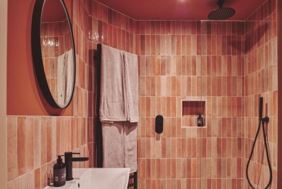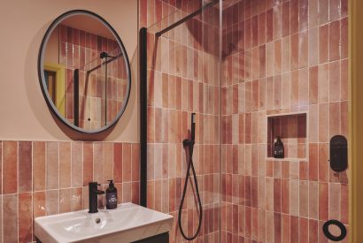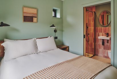 All bathrooms share a refined design: Mandarin Stone pink tiles, sage vanities and Edward Bulmer natural paints give each space a soft, cohesive aesthetic. Original prints by Su France add character throughout, with her Earth Pigment series displayed in the ground floor rooms and two further artworks upstairs.