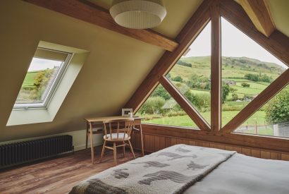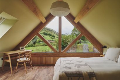 Tucked away in a peaceful Welsh valley, this stylish barn is a light-filled retreat where oak beams, panoramic countryside views and cosy living spaces create the perfect escape for a group getaway.