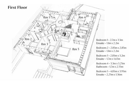 Step through the stylish pivot front door into a light-filled oak-framed interior where tradition meets contemporary design. Three king-size en-suite double bedrooms are positioned at mid-level for easy access, while two further second floor king-size rooms (one en-suite and one with access to the hallway bathroom) enjoy elevated views across the meadows and hills. Each bedroom has its own distinctive feature from direct garden access from bedroom two, to the full-height picture window in bedroom five which is the star of the barn, beautifully framing uninterrupted views of the surrounding countryside and flooding the space with natural light.
