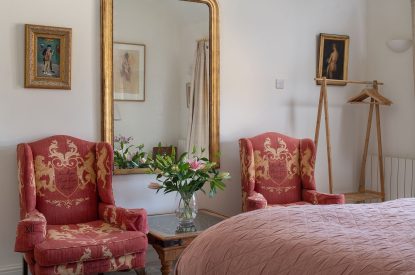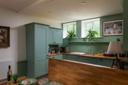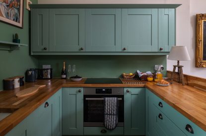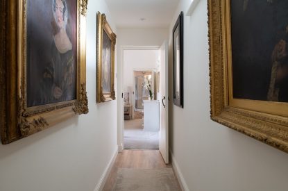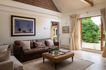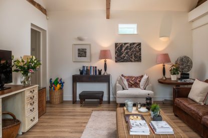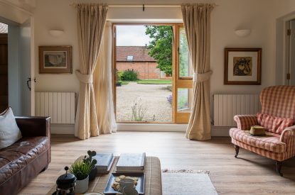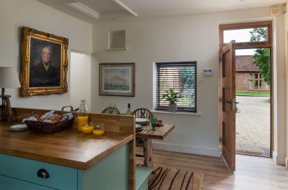 The barn conversion begins with a bright and airy living room which features exposed beams, floor-to-ceiling windows with luxurious designer curtains and a mixture of old masters and contemporary paintings. Relax on the sumptuous sofa or cosy armchair with your favourite programme on the Smart TV or immerse yourself in one of the books provided for you to enjoy during your stay. There is also a desk for remote working if required.