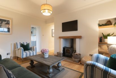 This newly renovated property begins with a stylish and cosy lounge, beautifully furnished with a sofa, two armchairs and a crackling log-burning stove. It’s the perfect place to watch TV and socialise after a day of exploring.