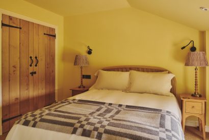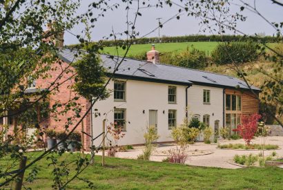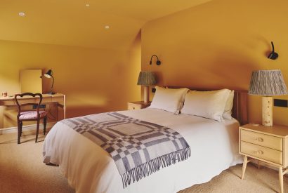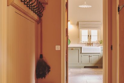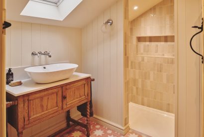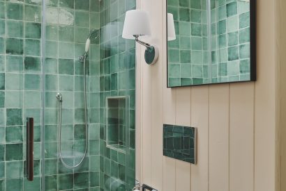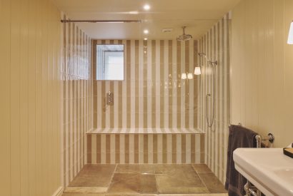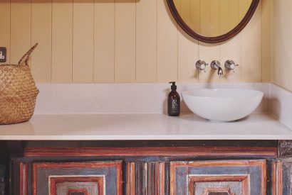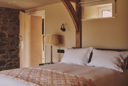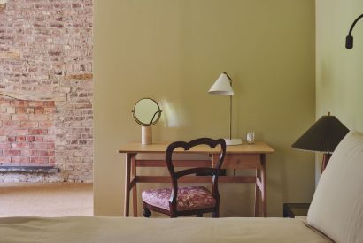 Upstairs and downstairs, the five king-size en-suite bedrooms each have their own distinctive personality, thoughtfully designed to reflect both the house’s history and its surroundings. Sage takes its name from the soft green tiles of its bathroom and offers peaceful meadow views. Wren, compact and perfectly formed, and is finished with gentle blue bathroom tiles. Rosalind brings warmth and joy with yellow-painted walls and a pink-tiled bathroom, looking out over the Acer tree and paddocks. At the gable end of the house, Agnes is a serene retreat above the herb garden, complete with a writing desk and windows framing both meadow and riverside views. Finally, Moss, set at garden level for easy access, is cool and calming in tone, with a walk-in shower and wall markings that reveal where the mill’s great wheel once stood.