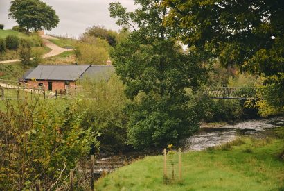 Outside, a beautifully designed arbour by the orchard apple trees provides a charming spot for alfresco dining and gatherings. A fire pit invites starlit evenings, while the handcrafted Heartwood Sauna, outdoor shower and river steps offer spa-like indulgence. Guests can explore the 3-acre conservation area and enjoy miles of private walking paths through fields and woodland.