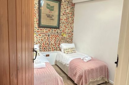 Two bedrooms provide flexible, restful accommodation: one with a double bed, the other with a zip and link king-size bed, both styled with calming colour palettes, soft linens and simple, welcoming décor. A modern bathroom with a walk-in shower and quality fittings ensures comfort throughout your stay.