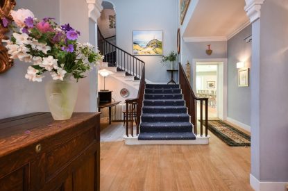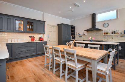 There’s also plenty of space to hang coats at the front and back doors, as well as a boot room and utility area with underfloor heating (same as in the kitchen) that includes a shower room and a WC. Ideal for those coming in from time in the countryside or on the beach.