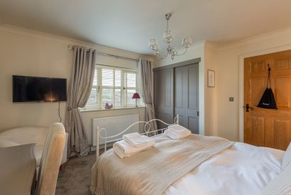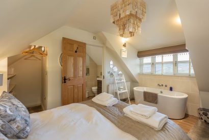 There are three bedrooms. The master bedroom occupies the entire top floor and has a king-size bed, plus a freestanding bath in the bedroom and an en-suite shower room. The other two bedrooms are on the first floor, one with a king-size bed and the other is a twin room (with zip and link beds that can be set up as a super-king-size bed if preferred). All bedrooms have a wall-mounted TV and a hairdryer.