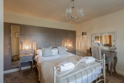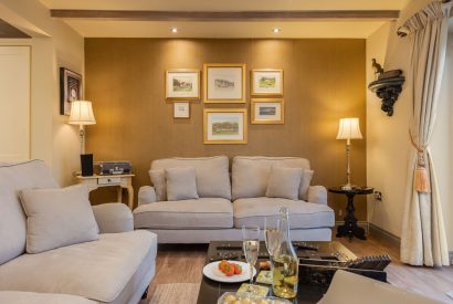 The kitchen space, with its granite worktops, Wedgwood crockery and Royal Doulton glassware, is equipped with a gas hob, electric oven, fridge/freezer, microwave, coffee machine, toaster, kettle and a dishwasher. Plus, there’s a washing machine and tumble dryer.