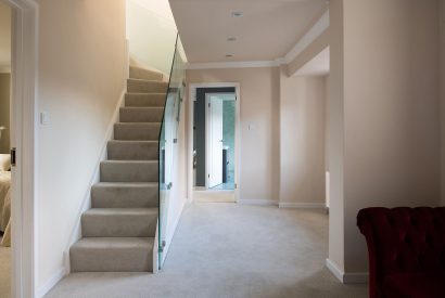 Upstairs, five beautifully styled bedrooms each offer their own sanctuary. The master suite feels like a private spa, with vaulted ceilings, a Juliet balcony, a dressing room and an indulgent bathroom with double rainfall showers and a deep soaking tub. Alongside this are four additional bedrooms, one super-king-size and two doubles, each thoughtfully designed for comfort. The entire top floor is dedicated to a charming children’s suite, complete with its own twin bedroom, an ensuite bathroom and a cosy sitting room where little ones can relax, read, or play games on oversized beanbags. It’s a wonderfully self-contained space that gives children their own floor to unwind and feel at home.