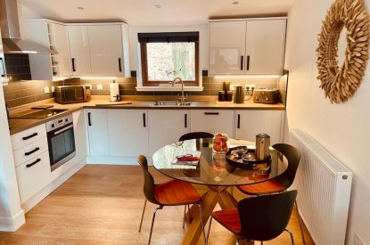 The open-plan layout leads seamlessly into a modern, fully equipped kitchen with an electric oven, hob, fridge/freezer and dishwasher. A dining area offers space for leisurely breakfasts, relaxed dinners and evenings spent sharing stories.