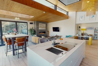 The open-plan kitchen and dining space is ideal for group living. A well-equipped kitchen with modern appliances, a breakfast bar and generous worktops makes cooking a pleasure, while the dining table seats everyone together beneath large windows. Sliding doors open onto the terrace, so meals can flow effortlessly outdoors on sunny days.