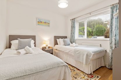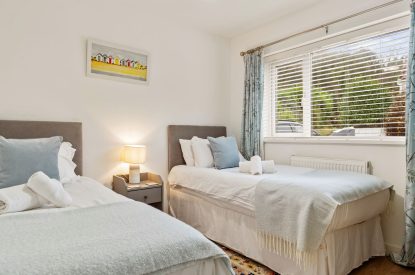 There are two delightful bedrooms with neutral decor and high-quality soft furnishings. The first bedroom features a king-size bed and the second bedroom has two single beds. Both bedrooms share the modern hallway bathroom which comprises a shower over the bath. There is also a separate toilet off the entrance hallway.
