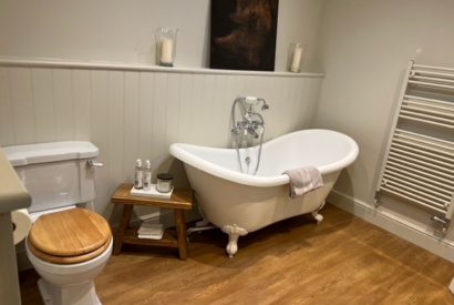 Step into this charming barn’s open-plan kitchen and living area, where exposed beams, cosy interiors and unique artwork create a welcoming feel. The country-style kitchen is fully equipped for easy self-catering and includes a breakfast bar and dining table for sharing meals. Relax in the inviting lounge with plush sofas, Smart TV, and plenty of books and games. Two elegant bedrooms offer restful retreats – both with king sized beds. One with an en suite bathroom with roll top bath and shower and the other with a large walk-in shower. Outside, enjoy a courtyard patio with garden furniture.
