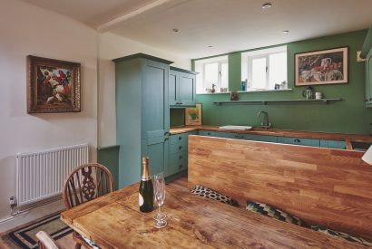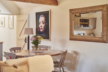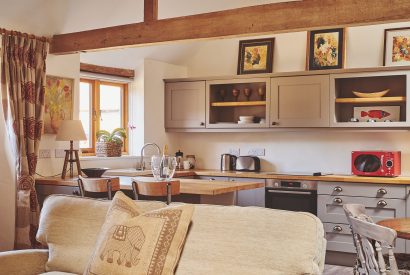 Step into this charming barn’s open-plan kitchen and living area, where exposed beams, cosy interiors and unique artwork create a welcoming feel. The country-style kitchen is fully equipped for easy self-catering and includes a breakfast bar and dining table for sharing meals. Relax in the inviting lounge with plush sofas, a wood-burning stove, Smart TV and plenty of books and games. Two elegant bedrooms offer restful retreats - one with a four-poster and the other with a super king-size bed - plus a shared bathroom with shower over bath. Outside, enjoy a courtyard patio with garden furniture.